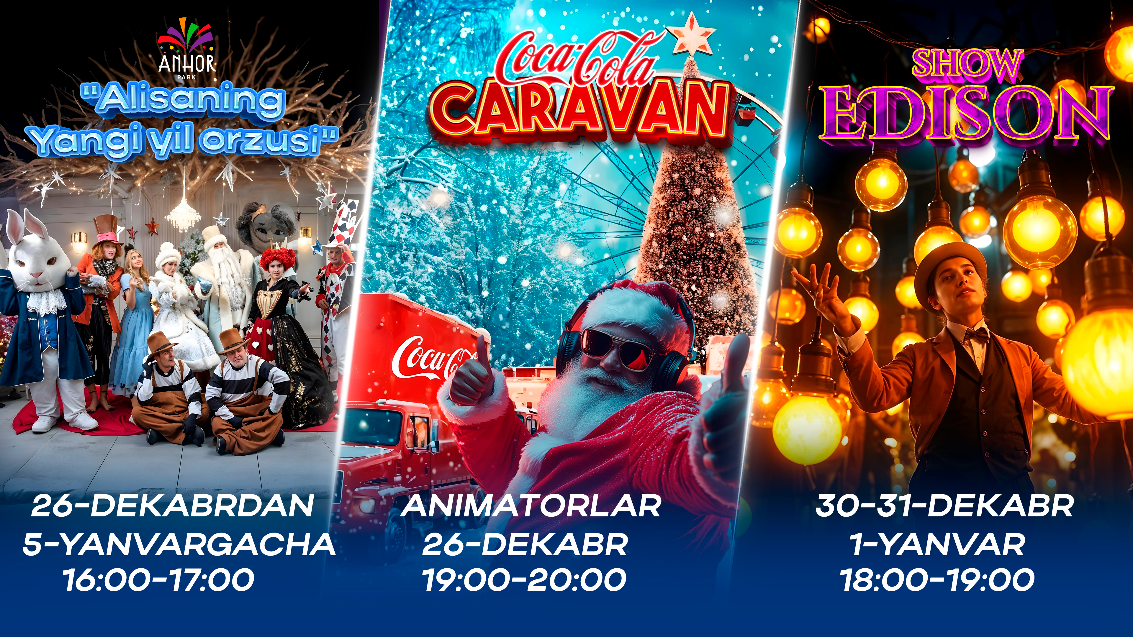 Qaysi kunni tanlashingizdan qat’iy nazar, sizni quvonch, tabassum va mo‘jizalar kutmoqda. Bu qishda o‘zingiz va yaqinlaringizga ertak tuhfa qilish imkoniyatini qo‘ldan boy bermang!